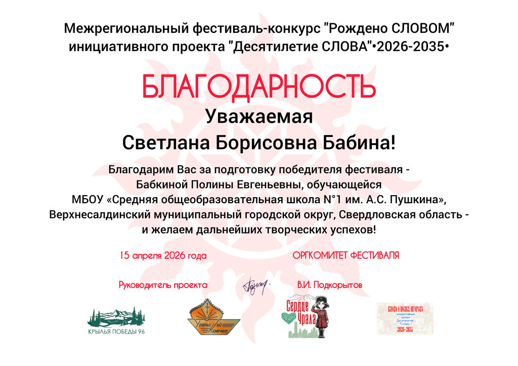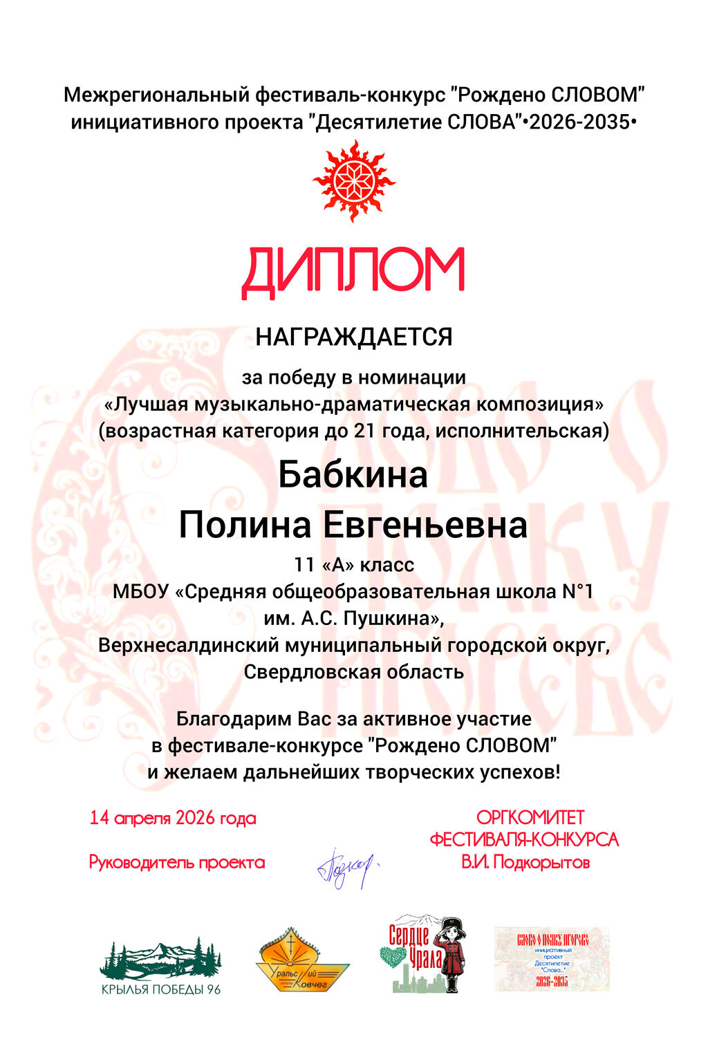 Прошел Межрегиональный Фестиваль-конкурс «Рождено СЛОВОМ», посвященный 10-летию «Слова о полку Игореве». Бабкина Полина-победитель в номинации «Лучшая музыкально-драматическая композиция»