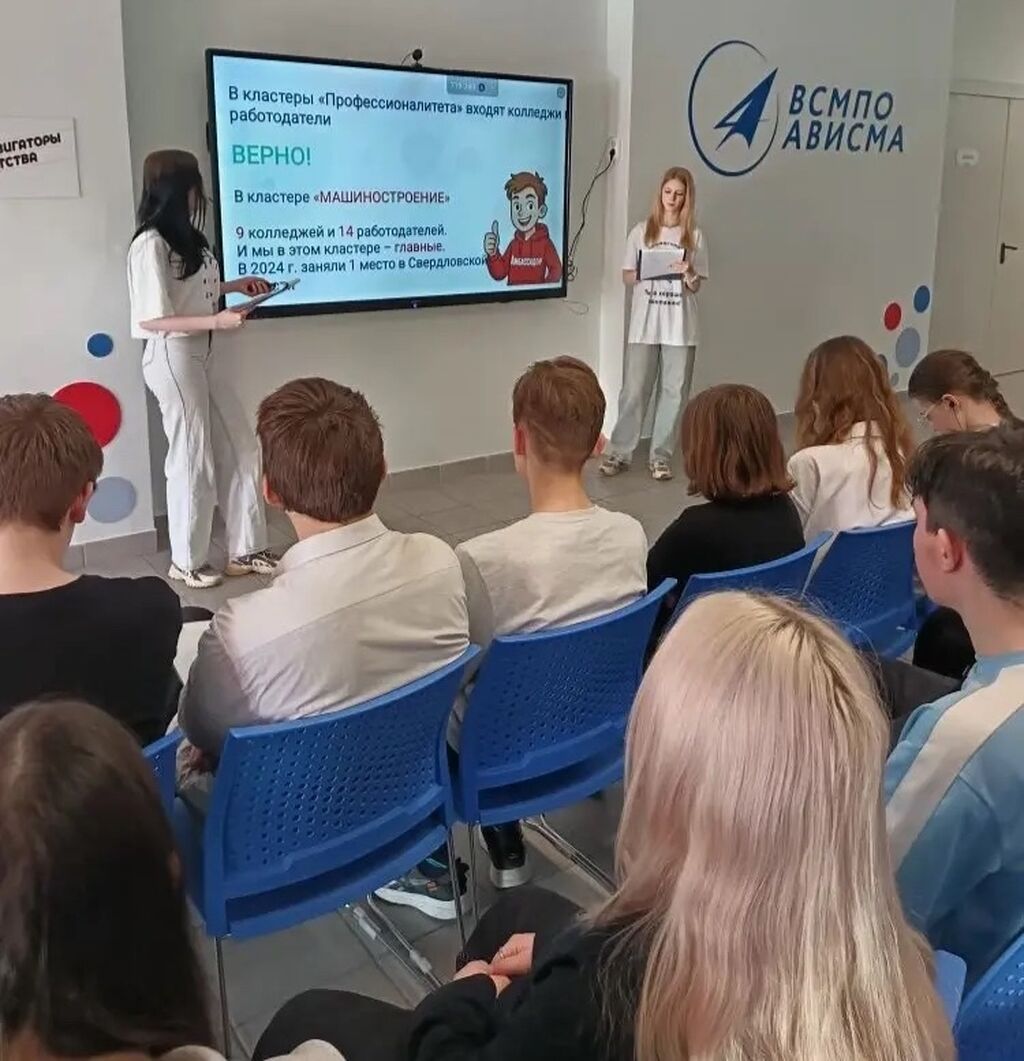 16 апреля в рамках Федерального проекта «Профессионалитет» в школьной Точке кипения состоялась встреча учащихся 9а и 9б классов с амбассадорами из Верхнесалдинского авиаметаллургического колледжа Викой и Настей.