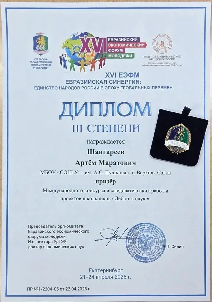 Шангареев Артем, ученик 8 «Б» класса, призер Международного конкурса исследовательских работ и проектов школьников «Дебют в науке»!